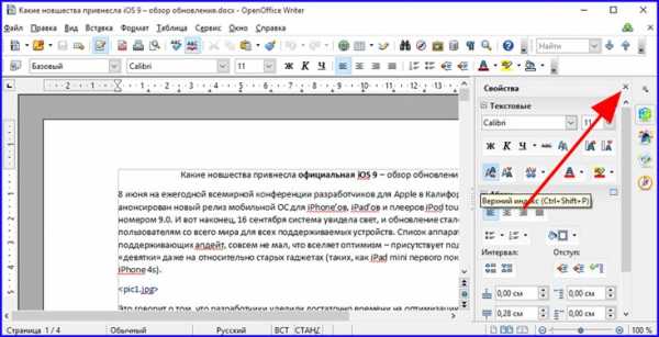 Стоит отметить, совсем неплохо. Начнем с текстового редактора Writer. Важное замечание, которое сразу же бросается в глаза, – это боковая панель с дублирующими свойствами документа.
