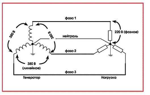 Между фазами в трехфазной энергетической системе возникает напряжение, называемое линейным. Его номинальное значение составляет 380 В. Дадим определение фазному напряжению — это напряжение между нулем и одной из фаз. Номинальное значение фазного напряжения составляет 220 В.