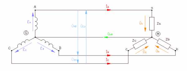(на рисунке ниже генератор изображён слева, а трёхфазный двигатель – справа; точка G – это “нейтраль”).