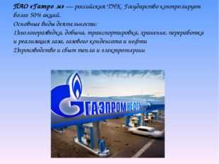 Описание слайда:ПАО «Газпро́м» — российская ТНК. Государство контролирует более 50% акций. Основные виды деятельности: 1)геологоразведка, добыча, транспортировка, хранение, переработка и реализация газа, газового конденсата и нефти 2)производство и сбыт тепла и электроэнергии