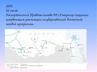 Описание слайда:2002 16 июля Распоряжением Правительства РФ «Газпрому» поручена координация реализации государственной Восточной газовой программы.