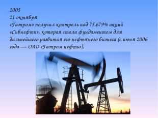 Описание слайда:2005 21 октября «Газпром» получил контроль над 75,679% акций «Сибнефти», которая стала фундаментом для дальнейшего развития его нефтяного бизнеса (с июня 2006 года — ОАО «Газпром нефть»).