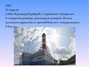 Описание слайда:2007 25 апреля Совет директоров утвердил Стратегию «Газпрома» в электроэнергетике, реализация которой сделала компанию крупнейшим производителем электроэнергии в России.