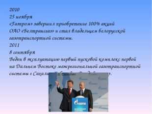 Описание слайда:2010 25 ноября «Газпром» завершил приобретение 100% акций ОАО «Белтрансгаз» и стал владельцем белорусской газотранспортной системы. 2011 8 сентября Веден в эксплуатацию первый пусковой комплекс первой на Дальнем Востоке межрегиональной газотранспортной системы « Сахалин-Хабаровск-Владивосток».