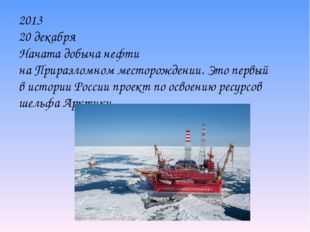 2013 20 декабря Начата добыча нефти на Приразломном месторождении. Это первый в истории России проект по освоению ресурсов шельфа Арктики.