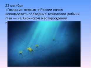 Описание слайда:23 октября «Газпром» первым в России начал использовать подводные технологии добычи газа — на Киринском месторождении на шельфе Сахалина.