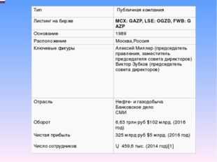 Описание слайда:Тип Публичная компания Листинг на бирже MCX: GAZP, LSE: OGZD, FWB: GAZP Основание 1989 Расположение Москва,Россия Ключевые фигуры Алексей Миллер (председатель правления, заместитель председателя совета директоров) Виктор Зубков (председатель совета директоров) Отрасль Нефте- и газодобыча Банковское дело СМИ Оборот 6,63 трлн руб $102 млрд. (2016 год) Чистаяприбыль 325 млрд руб $5 млрд. (2016 год) Число сотрудников ▲ 459,6 тыс. (2014 год)[1]