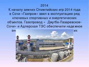 2014 К началу зимних Олимпийских игр 2014 года в Сочи «Газпром» ввел в эксплуатацию ряд ключевых спортивных и энергетических объектов. Газопровод « Джугба-Лазаревское-Сочи» и Адлерская ТЭС обеспечили надежное энергоснабжение города и прилегающих районов.