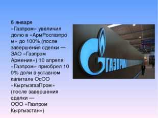 Описание слайда:6 января «Газпром» увеличил долю в «АрмРосгазпром» до 100% (после завершения сделки — ЗАО «Газпром Армения») 10 апреля «Газпром» приобрел 100% доли в уставном капитале ОсОО «КыргызгазПром» (после завершения сделки — ООО «Газпром Кыргызстан»)