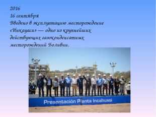 Описание слайда:2016 16 сентября Введено в эксплуатацию месторождение «Инкауаси» — одно из крупнейших действующих газоконденсатных месторождений Боливии.