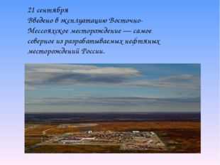 Описание слайда:21 сентября Введено в эксплуатацию Восточно-Мессояхское месторождение — самое северное из разрабатываемых нефтяных месторождений России.