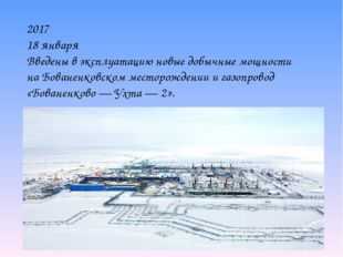 Описание слайда:2017 18 января Введены в эксплуатацию новые добычные мощности на Бованенковском месторождении и газопровод «Бованенково — Ухта — 2».