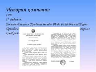 Описание слайда:История компании 1993 17 февраля Постановлением Правительства РФ во исполнение Указа Президента РФ Государственный газовый концерн «Газпром» преобразован в Российское акционерное общество.