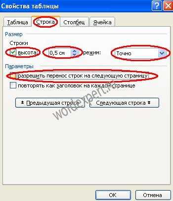 На вкладке Строка ставим чек высота размер 0,5 см, режим – Точно, снимаем чек разрешить перенос строк на следующую страницу.