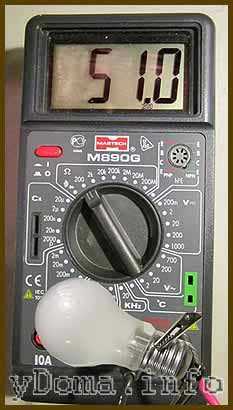 Сопротивление нити накала лампочки составило 51 Ом, что свидетельствует о ее исправности. Если бы нить была в обрыве, то прибор показал бы бесконечное сопротивление. Сопротивление галогенной лампочки на 220 В мощностью 50 ватт при свечении составляет около 968 Ом, автомобильной лампочки на 12 вольт мощностью 100 ватт, около 1,44 Ом.