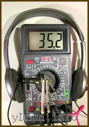 Одним концом щупа прикасаются к общему выводу, а вторым по очереди к выводам правого и левого каналов. Сопротивление должно быть одинаковым и составлять около 40 Ом. Обычно в паспорте на наушники сопротивление указывается.