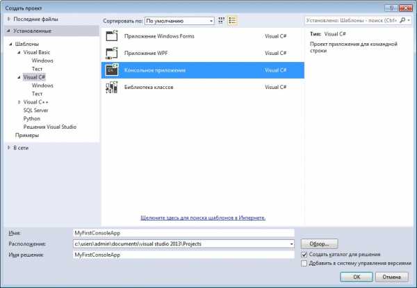 Чтобы написать нашу первую программу нам понадобится создать новый проект в Visual Studio. Для этого щелкните на ссылке «Создать проект…» (New Project…) слева на начальной странице, либо нажмите Файл->Создать проект (Ctrl+Shift+N) (File-> New Project). В появившемся окне выберите раздел «Visual C#», а в списке шаблонов: «Консольное приложение» Visual C#.