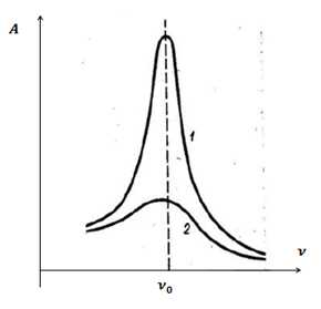 На рис.1 показана зависимость амплитуды вынужденных колебаний от частоты вынуждающей силы. Видно, что эта амплитуда достигает максимума при определенном значении частоты, т.е. при , где собственная частота колебательной системы. Кривые 1 и 2 отличаются величиной силы трения. При малом трении (кривая 1) резонансная кривая имеет резкий максимум, при большей силе трения (кривая 2) такого резкого максимума нет.