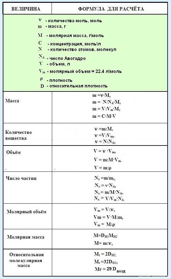 Масса | m =·M, m = V:Vm·M, m = N/NA·M, m =mo·N, m = C·M·V |