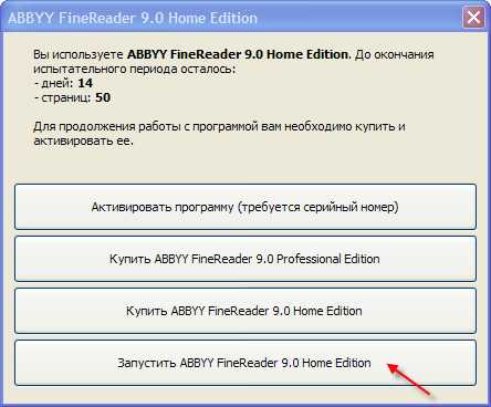 ΠΡΠΎΠ±Π½Π°Ρ Π²Π΅ΡΡΠΈΡ ABBYY FineReader 9.0 Home Edition Π΄Π΅ΠΉΡΡΠ²ΡΠ΅Ρ 14 Π΄Π½Π΅ΠΉ ΠΈ ΡΠ°ΡΡΡΠΈΡΠ°Π½Π° Π½Π° ΠΎΠ±ΡΠ°Π±ΠΎΡΠΊΡ 50 ΡΡΡΠ°Π½ΠΈΡ. ΠΠΎ ΠΎΠΊΠΎΠ½ΡΠ°Π½ΠΈΠΈ ΡΠ΅ΡΡΠΎΠ²ΠΎΠ³ΠΎ ΠΏΠ΅ΡΠΈΠΎΠ΄Π° ΠΈ ΠΈΡΡΠ΅ΡΠΏΠ°Π½ΠΈΡ Π»ΠΈΠΌΠΈΡΠ° ΡΡΡΠ°Π½ΠΈΡ ΠΏΡΠΎΠ³ΡΠ°ΠΌΠΌΡ Π½ΡΠΆΠ½ΠΎ Π±ΡΠ΄Π΅Ρ ΠΏΡΠΈΠΎΠ±ΡΠ΅ΡΡΠΈ Π² Π²Π΅ΡΠ½ΠΎΠ΅ ΠΏΠΎΠ»ΡΠ·ΠΎΠ²Π°Π½ΠΈΠ΅. ΠΠ»Ρ ΡΠ°Π±ΠΎΡΡ Π² ΡΠ΅ΡΡΠΎΠ²ΠΎΠΉ Π²Π΅ΡΡΠΈΠΈ FineReader Π½Π°ΠΆΠΌΠΈΡΠ΅ ΠΊΠ½ΠΎΠΏΠΎΡΠΊΡ Β«ΠΠ°ΠΏΡΡΡΠΈΡΡ ABBYY FineReader 9.0 Home EditionΒ».