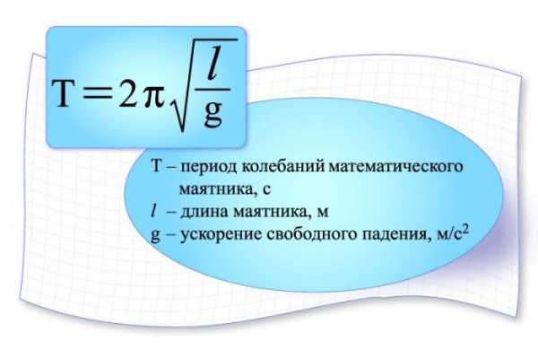 Π³Π΄Π΅ <math>l</math>Β β Π΄Π»ΠΈΠ½Π° ΠΏΠΎΠ΄Π²Π΅ΡΠ° (ΠΊ ΠΏΡΠΈΠΌΠ΅ΡΡ, Π½ΠΈΡΠΈ), <math>g</math>Β β ΡΡΠΊΠΎΡΠ΅Π½ΠΈΠ΅ ΡΠ²ΠΎΠ±ΠΎΠ΄Π½ΠΎΠ³ΠΎ ΠΏΠ°Π΄Π΅Π½ΠΈΡ.