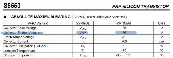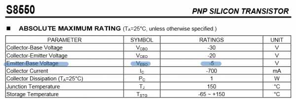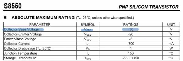 Например как в этом даташите на транзистор S8550 PNP структуры. Видите перед цифрой «30» знак минус? Если бы мы поменяли индексы, то получили бы, что VBCO =30 Вольт. Знак «минус» тогда бы исчез, но в то же время у нас индексы поменялись (я их даже выделил жирным шрифтом).