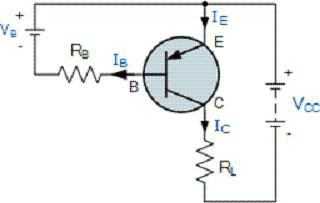 На этот раз коллектор подключен к напряжению питания VCC через нагрузочный резистор, RL, который ограничивает максимальный ток, протекающий через прибор. Базовое напряжения VB, которое смещает ее в отрицательном направлении по отношению к эмиттеру, подано на нее через резистор RB, который снова используется для ограничения максимального тока базы.