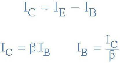 Итак, чтобы вызвать протекание базового тока в PNP-транзисторе, база должна быть более отрицательной, чем эмиттер (ток должен покинуть базу) примерно на 0,7 вольт для кремниевого прибора или на 0,3 вольта для германиевого. Формулы, используемые для расчета базового резистора, базового тока или тока коллектора такие же, как те, которые используются для эквивалентного NPN-транзистора и представлены ниже.