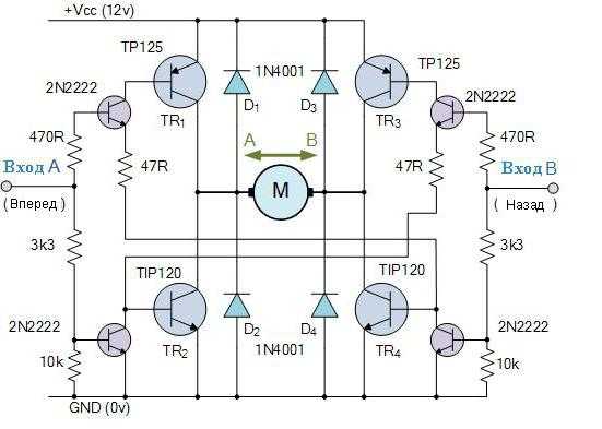 Например, когда транзистор TR1 включен, а TR2 выключен, вход A подключен к напряжению питания (+ Vcc), и если транзистор TR3 выключен, а TR4 включен, то вход B подключен к 0 вольт (GND). Поэтому двигатель будет вращаться в одном направлении, соответствующем положительному потенциалу входа A и отрицательному входа B.