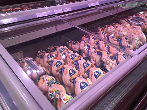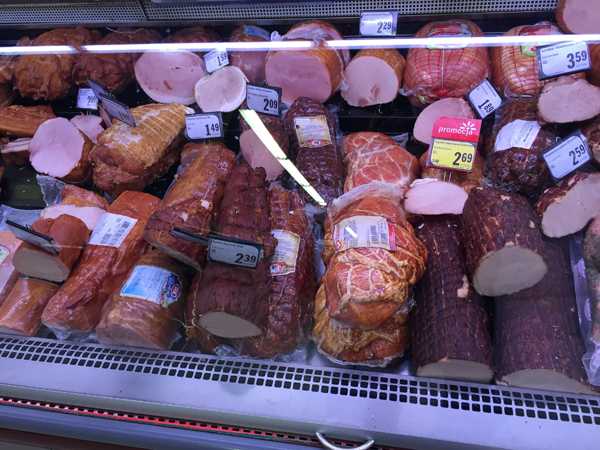 К выбору и качеству свежего мяса тоже претензий нет. Есть птица (курица, индюшатина, утка и т.п.), свинина, говядина. Либо на вес на прилавках, либо в ваккумных упаковках-лоточках (ножки, грудки, стейки, вырезки, гуляш и т.п.). Большой выбор фаршей. Мы, правда, готовые почти не берем, а просим в магазине «змелить» понравившийся кусок мяса — так вкуснее! Еще мясо могут для вас отбить на специальной машине прямо в магазине, дома так хорошо не получится