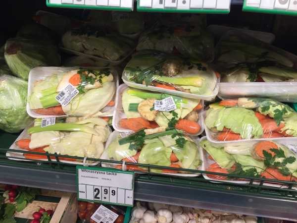 Овощи есть все как у нас, стоят тоже копейки. Что примечательно, в каждом супермаркете лежат готовые наборы для супа (wloszczyzna) — морковь, петрушка, сельдерей, порей, капуста и их вариации.