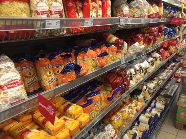 Здесь от российских реалий ничего не отличается — все виды макарон (недорогие, так как у нас в городе своя макаронная фабрика), разные каши, хлопья, отруби. Риса разного полно, единственный момент — очень редко попадается круглозерный, а мы любим именно его. С гречкой тоже никаких проблем.