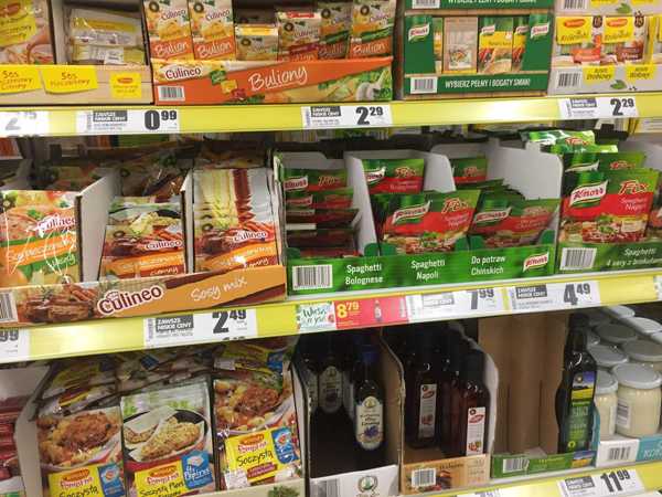 Касаемо продуктов и местной кухни — здесь нет ничего очень необычного или совсем непривычного. Практически все, что есть в российских супермаркетах, продается и тут. Вот даже хочешь квашеных огурчиков, тертого хрена, ржаного хлеба или консервированной рыбы в томате — пожалуйста! Короче, особой нужды в чем-либо не испытываешь и не удивляешься, разглядывая полки продуктовых магазинов. Более того, многие польские продукты активно поставлялись в РФ раньше. Правда, сейчас всякие санкции-шманкции, я уехала до их введения. Но знакомых россиянину брендов тут полно. Не только польских, конечно, но и международных. Правда, некоторые иначе называются. Вот Maggi тут — это Winiary (а Tide — Vizir). Но дизайн упаковок узнаваем.