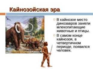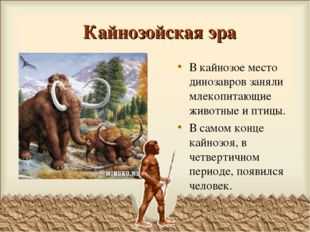 Описание слайда:Кайнозойская эра В кайнозое место динозавров заняли млекопитающие животные и птицы. В самом конце кайнозоя, в четвертичном периоде, появился человек.