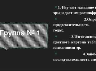 Описание слайда:Группа № 1 1. Изучает название каждой эры и дает им расшифровку. 2.Определяет продолжительность эр в годах. 3.Изготавливают из цветного картона таблички с названиями эр. 4.Запоминают последовательность смены эр.