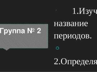 Описание слайда:Группа № 2 1.Изучает название периодов. 2.Определяет в состав какой эры они входят. 3.Изготавливают из цветного картона таблички с названиями периодов. 4.Запоминают последовательность смены периодов по эрам.