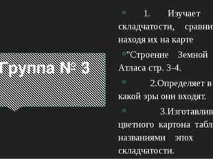 Описание слайда:Группа № 3 1. Изучает эпохи складчатости, сравнивая и находя их на карте “Строение Земной коры” Атласа стр. 3-4. 2.Определяет в состав какой эры они входят. 3.Изготавливают из цветного картона таблички с названиями эпох складчатости. 4.Запоминают последовательность смены эпох складчатости по периодам и эрам.