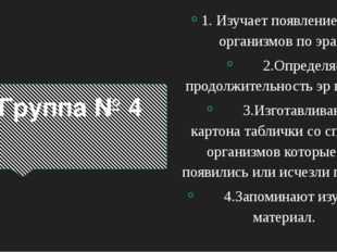Описание слайда:Группа № 4 1. Изучает появление живых организмов по эрам. 2.Определяет продолжительность эр в годах. 3.Изготавливают из картона таблички со списком организмов которые появились или исчезли по эрам. 4.Запоминают изученный материал.
