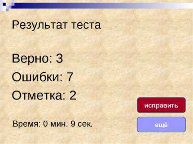 2 слайдРезультат теста Верно: 3 Ошибки: 7 Отметка: 2 Время: 0 мин. 9 сек. ещё исправить