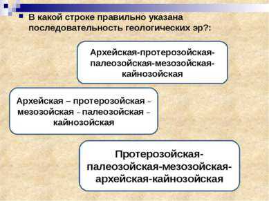 3 слайдВ какой строке правильно указана последовательность геологических эр?: Архейская-протерозойская-палеозойская-мезозойская-кайнозойская Архейская – протерозойская – мезозойская – палеозойская – кайнозойская Протерозойская-палеозойская-мезозойская- архейская-кайнозойская