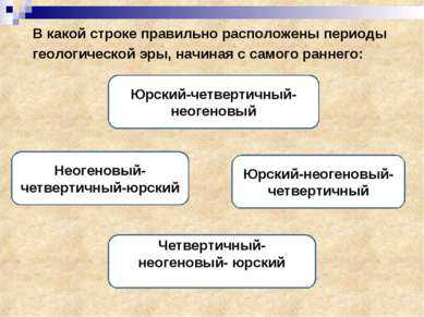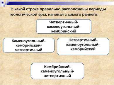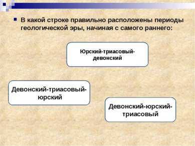 4 слайдВ какой строке правильно расположены периоды геологической эры, начиная с самого раннего: Девонский-триасовый- юрский Юрский-триасовый-девонский Девонский-юрский-триасовый