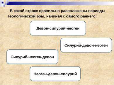 6 слайдВ какой строке правильно расположены периоды геологической эры, начиная с самого раннего: Силурий-девон-неоген Девон-силурий-неоген Силурий-неоген-девон Неоген-девон-силурий