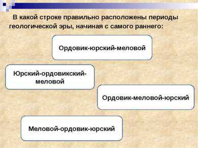 7 слайдВ какой строке правильно расположены периоды геологической эры, начиная с самого раннего: Ордовик-юрский-меловой Ордовик-меловой-юрский Юрский-ордовикский-меловой Меловой-ордовик-юрский