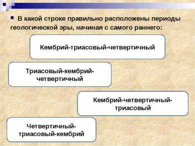 8 слайдВ какой строке правильно расположены периоды геологической эры, начиная с самого раннего: Кембрий-триасовый-четвертичный Кембрий-четвертичный-триасовый Триасовый-кембрий-четвертичный Четвертичный-триасовый-кембрий