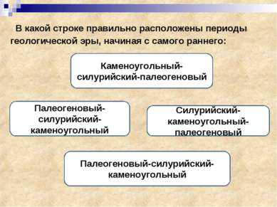 9 слайдВ какой строке правильно расположены периоды геологической эры, начиная с самого раннего: Силурийский-каменоугольный-палеогеновый Каменоугольный-силурийский-палеогеновый Палеогеновый-силурийский-каменоугольный Палеогеновый-силурийский-каменоугольный