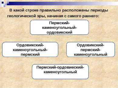 10 слайдВ какой строке правильно расположены периоды геологической эры, начиная с самого раннего: Ордовикский-каменоугольный-пермский Пермский-каменоугольный-ордовикский Ордовикский-пермский-каменоугольный Пермский-ордовиеский-каменоугольный