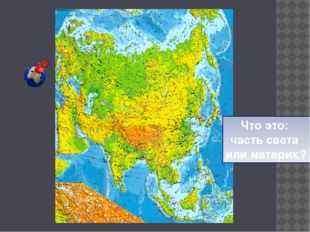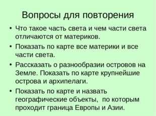 Описание слайда:Вопросы для повторения Что такое часть света и чем части света отличаются от материков. Показать по карте все материки и все части света. Рассказать о разнообразии островов на Земле. Показать по карте крупнейшие острова и архипелаги. Показать по карте и назвать географические объекты, по которым проходит граница Европы и Азии.