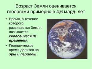 Описание слайда:Возраст Земли оценивается геологами примерно в 4,6 млрд. лет Время, в течение которого развивается Земля, называется геологическим временем. Геологическое время делится на эры и периоды