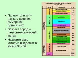 Описание слайда:Палеонтология – наука о древних, вымерших организмах Возраст пород – палеонтологический метод Назовите эры, которые выделяют в жизни Земли.