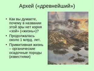Описание слайда:Архей («древнейший») Как вы думаете, почему в названии этой эры нет корня «зой» («жизнь»)? Продолжалась около 1 млрд. лет. Примитивная жизнь – органические осадочные породы (известняки)
